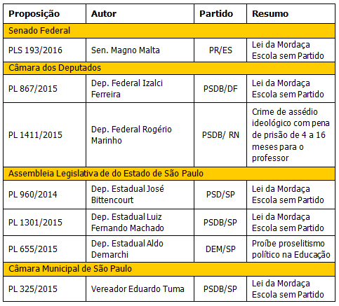 A nova lei proíbe a “doutrinação política e ideológica em sala de aula”. O professor não pode aproveitar-se da “inexperiência [dos alunos] para cooptá-los”, nem “prejudicá-los em razão de suas convicções políticas”. Deve também abrir mão de conteúdos que confrontem os princípios da lei.
