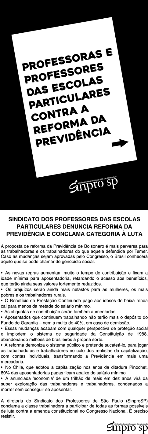 Carta distribuída no Dia Nacional de Luta em Defesa da Previdência, em 22 de março de 2019, na Av. Paulista.