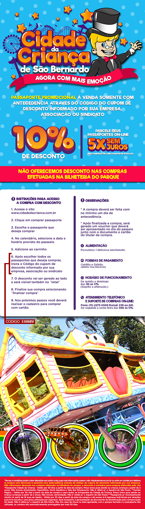 Para a compra dos passaportes e código do cupom de desconto que deverá ser aplicado antes de finalizar a compra, siga as instruções conforme arte de cada atração.