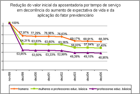 Desde 1º de dezembro de 2005 as aposentadorias por tempo de serviço concedidas pelo INSS estão mais achatadas. A redução média é de 0,6% em relação aos concedidos em novembro de 2005. Nos últimos sete anos (tomando por base novembro de 1998), o achatamento acumulado foi de 31,3% para os homens e 42,5% para as mulheres. A redução para os professores e professoras de educação básica foi de 42,5% e 51%, respectivamente.